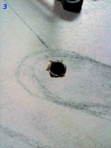 Quite las aletas y cuidadosamente perforar agujeros de 9mm de la placa base. Accidentalmente sobre los agujeros perforados y necesaria para los agujeros de la manga como se puede ver arriba. No es necesario si se realiza correctamente. Ahora haz tus pernos y les golpee cuidadosamente en el orificio de las aletas. Añadir una de las tuercas y apriete con una llave en la cabeza del perno (si no usa carro tornillos) y la tuerca. Tan firmemente como pueda sin romper las aletas. (Foto de ref: 2, 3)