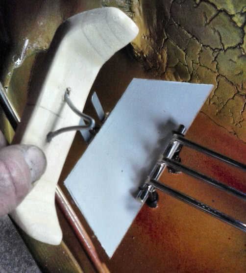 Corte el bloque de pino en ángulo de 45 grados cada extremo. Entonces la forma como en la primera foto arriba. Esto requerirá que vio pequeñas hendiduras a lo largo de la longitud de la desviación y el cincel la forma. Terminar con papel de lija. Mida y marque el centro del deflector y perfore dos agujeros pequeños para el radio del alambre esgrima uniformemente espaciados de la marca. Asegúrese de que perforar los orificios de aproximadamente el mismo ángulo que nuestro doblado V en forma de wire.and de esgrima no van todo el camino de la madera. Inserte el cable y frote con un poco de pegamento de madera.