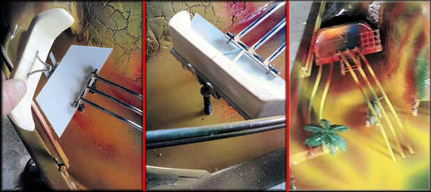 Sentarse el bloque deflector en la parte inferior de madera/cartón delgado y trace la forma exterior. No cortar el interior de la parte inferior. Error fácil hacer :) Líquido de uñas y atornille o clave la parte inferior para el deflector. Ahora siente el deflector en la placa base y marca donde los tornillos traseros y delanteros tiene que ir a sostener nuestra desviación. Añadir el soporte de medio L (Fig 1, 5) para el tornillo trasero y los soportes en L poco a los tornillos delanteros y luego añadir la goma alambre mosca a todos los tornillos. Atornillar cuidadosamente en la buena y recta. Añadir lo dos 45 mm y dos tornillos pequeños en la parte superior del deflector. Agregar las bandas de goma alrededor de los tornillos para formar la V en forma de pared. Sentarse el deflector en la parte delantera y traseros soportes en L