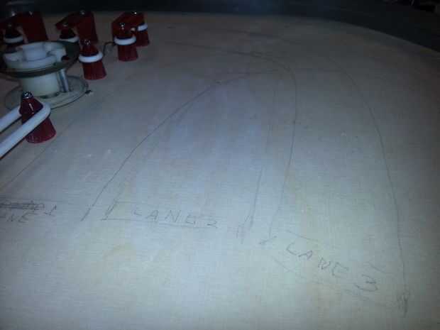 Imaginar la "sombra" de su rampa terminada, y donde aterriza en el tablero. Dibujar con lápiz, si usted está inclinado por el mundo real, o modelo en su programa de CAD de elección. Nuestro dibujó a lápiz en el campo de juego real, luego lo copió aproximadamente en papel, asegurándose de obtener exacta, los orificios izquierdos y derecho y, en la rampa más grande, indicando que pasó sobre la rampa más pequeños. Hice la nota de la altura necesaria que en ese momento. Si la rampa debe ir, sobre o alrededor de otras cosas Asegúrese de tener en cuenta estos. Asegúrese de que vas a tener habitación en el campo de juego para el montaje de hardware. Corte tu huella de papel.