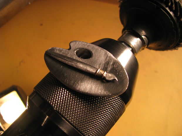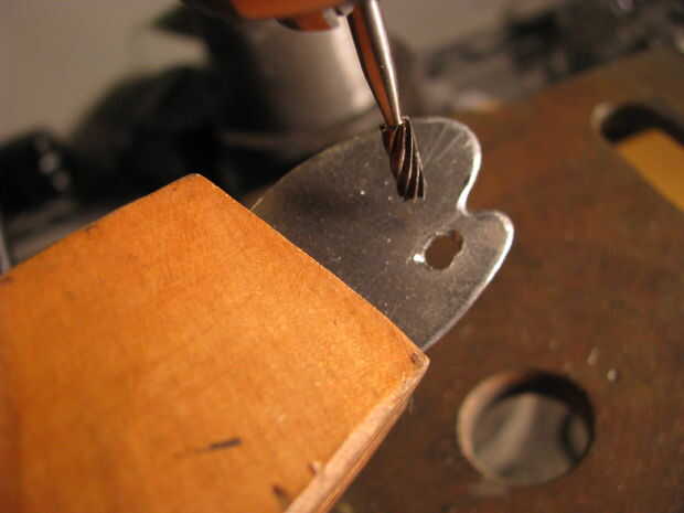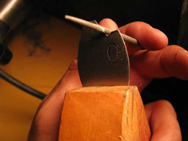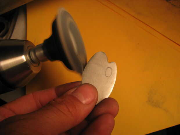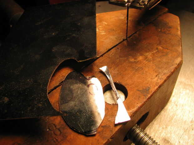 Yo recorte la forma de mi sierra y había refinado la forma con una Lima. Para el agujero interno me perforó un agujero y utilizado un archivo para darle forma. Estoy usando chapa de calibre 22 en la tienda de mejoras para el hogar.