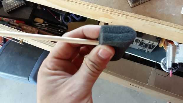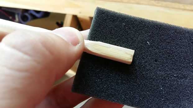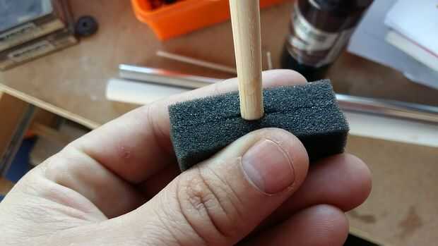 Una vez que la primera mitad de los palillos se pega poner pegamento CA en el lado no-pegado del palillo de la tajada, un grano muy fino en la parte superior de la espuma, luego doblar la espuma encima y esperar a establecer.
