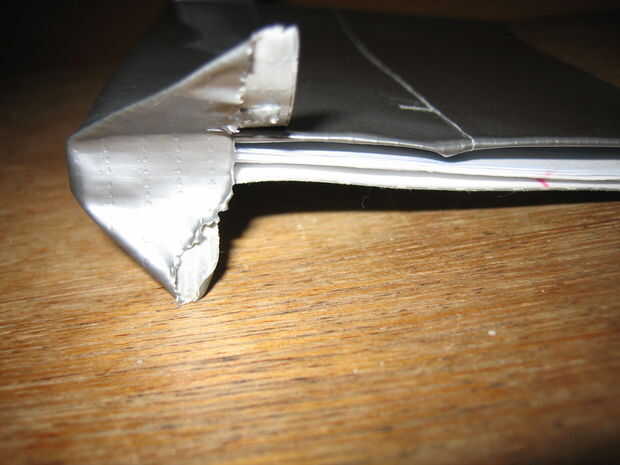 toma la cinta del conducto y cubrir completamente los trozos de papel en la parte superior de la pila de corte y la parte inferior. Luego, tome un pedazo de cinta del tamaño del borde de la pila con 1/2 un ecsess pulgadas ya sea final y que conecten cualquier cubierta, como una espina en la pila. a continuación, presione la ecsess en la parte superior e inferior y cortar las aletas del triángulo. (ver foto 2). esa fue la parte más difícil. ¡ Felicidades!