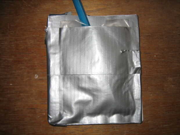ahora poner la funda de la tarjeta en el centro de la portada. cinta adhesiva en la cubierta, pero no selle la abertura en la parte superior.
