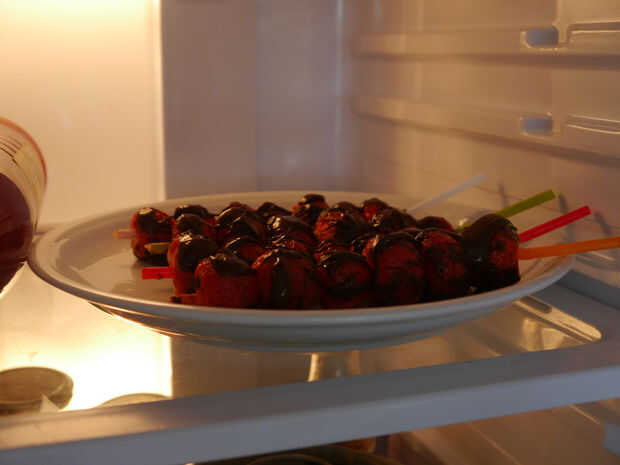 Poner los pinchos de fresas en la nevera para que el chocolate puede establecer.