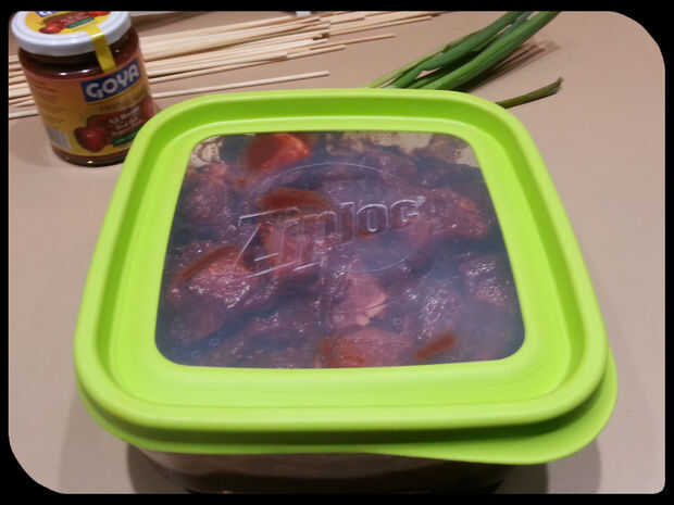 Cubo el solomillo en trozos de aproximadamente 1.5-2 pulgadas cuadradas. Coloque la carne en cubos en un recipiente de vidrio adecuado para adobar (para que los contenedores de plástico no Haz teñidos) y vierta el adobo sobre la parte superior. Mezclar bien y luego cúbralo y refrigérelo durante unas tres horas.