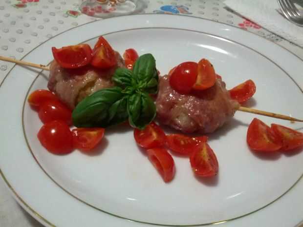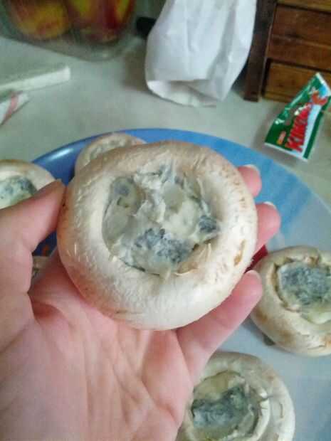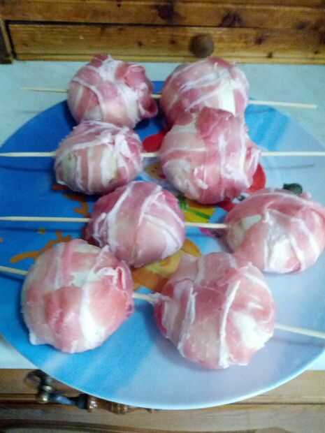 Empezar con quitar el tallo de hongo y claro si la suciedad. Rellenar los champiñones con queso azul y envolverlos con panceta. Asegúrese de que la base de las setas está bien cubierta en caso contrario el queso sale. Cadena de las setas en los pinchos y ponerlos en una fuente para horno. Añadir unas gotas de aceite y cocerlos en el horno durante unos 20 minutos.