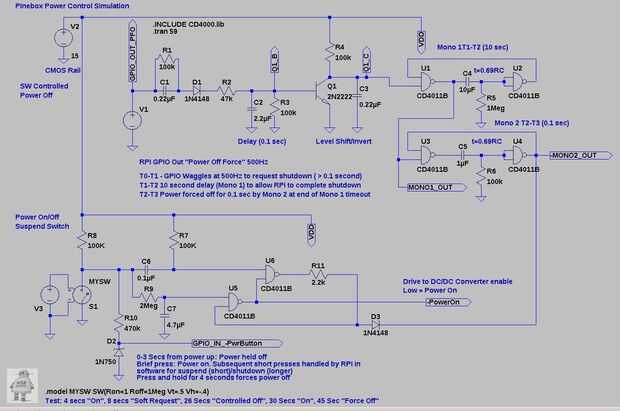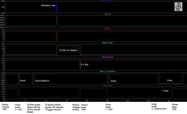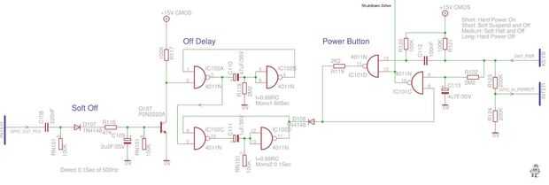 Dos monostables (IC102A-D) poner en práctica la demora: 1 Mono es 60 segundos y Mono 2 es 0,1 segundos, para que unos 60 segundos después de las señales de la Pi, un breve pulso de cancelar (0,1 seg) se aplica para el seguro de energía a través de D108.