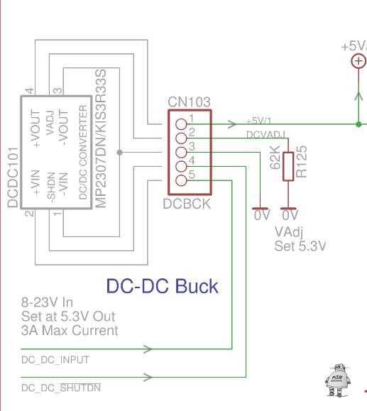 Entregado, el módulo proporciona 5.0V. El PI de frambuesa, se recomienda 5.25V. Además, como esto tiene que pasar por un FET o dos (con una pequeña pérdida), además de conectores etc.. Decidí aumentar el voltaje. Un cable extra se une al módulo para sacar el perno de ajuste de voltaje y un resistor (R125) está conectado a tierra para subir la tensión.