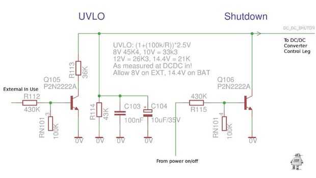 El bajo voltaje de bloqueo (UVLO) detiene el convertidor DC-DC de funcionamiento si la batería está agotada, o el voltaje de entrada externo es insuficiente. Hay dos diferentes niveles seleccionados. Uno para la energía de la batería y otro para alimentación externa. Batería: 14.4V (0.9V celular), en energía externa: 8V