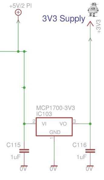 En lugar de cargar la fuente de 3V3 de Pi, que tiene una limitada actual, he utilizado un regulador separado de mi fuente de 5V. Esto también tiene algunos repuesto capacidad de 3V3 para placas de prototipo conectados al conector 40 pines GPIO, en lugar de la fuente de PIs.