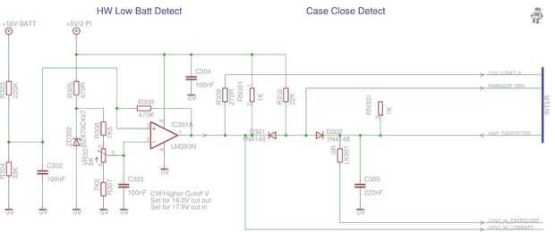 Cuando el nivel de batería empieza a "baja" (1.0v / celular = 16V) este circuito detecta esto. Cargas no esenciales se abandonó para preservar la energía restante en la batería, y el Raspberry Pi está indicada para saber comenzar una parada sincronizada (p. ej. alto en 5 minutos). Los rangos de entrada "Baja bat" GPIO 0.9V a 4.4V