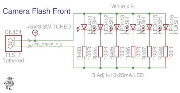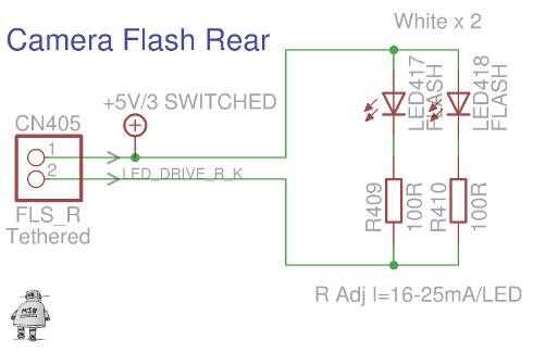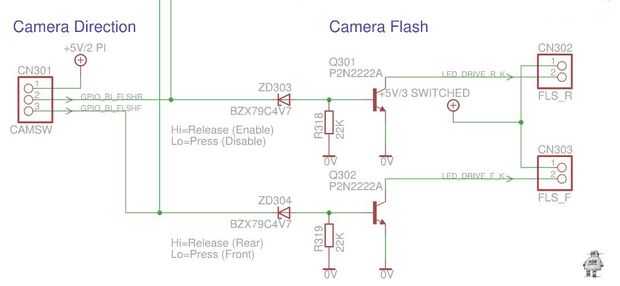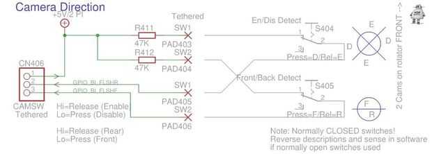 Dos GPIOs se utilizan para conducir la parte delantera y trasera destellos y luces para el hilandero/módulo de cámara. El mismo GPIOs se utilizan como entradas para detectar dos microinterruptores para la detección de la dirección de la cámara. (Frontal, trasera, lateral, apagado)