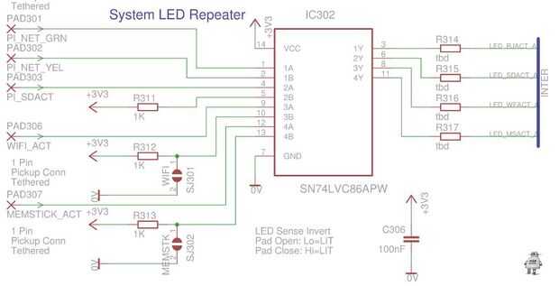 Para conducir mi repetidas LEDs, utilicé un 3V3 74LVC86 chip (XOR cuádruple). Esto permite que el sentido de los LEDs de WIFI a invertirse y memstick, un truco que he usado antes en el diseño para el manejo de señales con desconocido/responsable para cambiar el sentido.