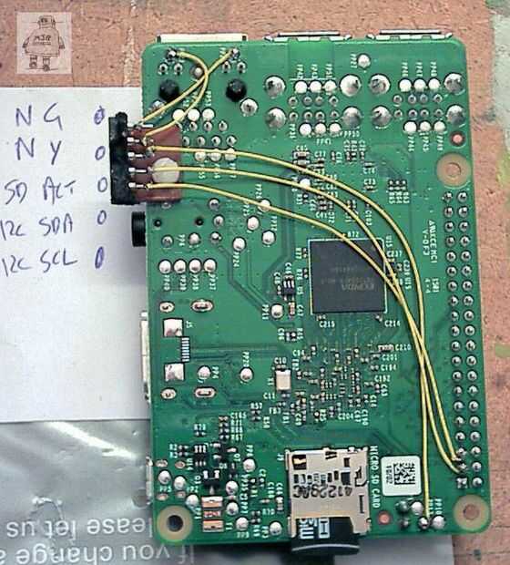 LED de actividad es muy útil, pero tristemente ellos son todo escondidos en el PI y los periféricos en la tapa. Cuatro señales de LED han sido recogidas y traídos hacia fuera aquí.