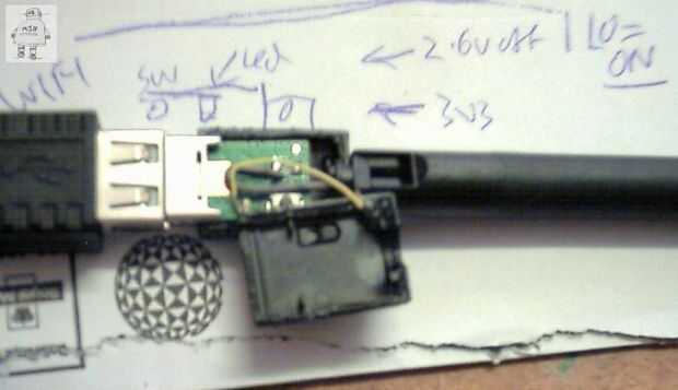Para obtener las necesarias señales de WIFI y Memory stick adaptador necesita hacks similares, afortunadamente sólo un solo perno. Usted tendrá que encontrar estas señales por sí mismo, he probado ambos lados de los LEDs en la mía para ver que dio una variación de tensión útil, y que forma redonda era "activo". Depende si el LED está conectado a + 5V o a tierra, donde la resistencia serie, y si la luz está "encendido, pero parpadea y se apaga para actividad" (como memory stick) o "apagado, parpadea en actividad" (como WiFi).