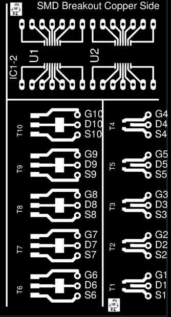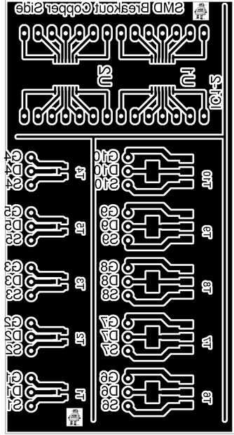En formato EagleCAD, diseñé una breakout junta 2 x 14 pin SMD ICs y 5 x 5 x SOT-223 FETs, sacó a 0,1" pastillas que pueden tomar los pernos o alambres además de SOT-23. Luego exporta la imagen del lado del cobre y usando GIMP, inundación llena las áreas no-track, espejada e imprimí. Inundación, relleno de las zonas de pista no reduce la cantidad de cobre a ser grabadas.