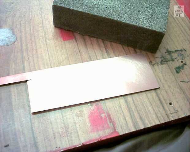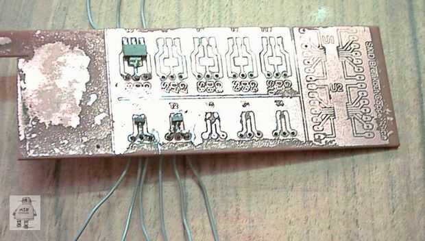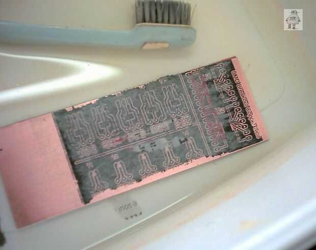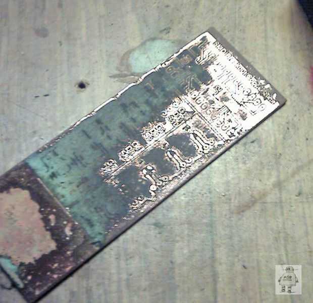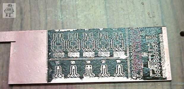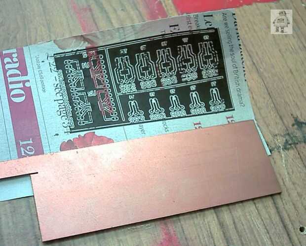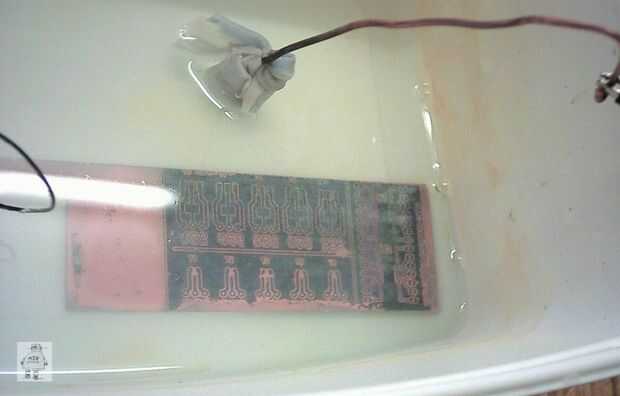 Después de haber fregado abajo algunos PCB de cobre del desecho con abrasivos para llegar limpio, luego limpiar encima con isopropanol (IPA), el papel de transferencia fue planchado, empapado en agua y suavemente cepillado para quitar el papel y luego grabado electrolítico en agua salada, usando una fuente actual de banco limitado.