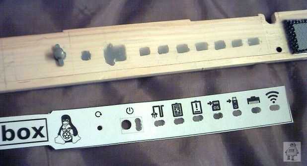 Una vez más, los gráficos de esta capa se produjeron en GIMP. Esta vez, los agujeros para los LEDs/interruptores fueron cortados antes de laminar. Esto deja un agujero con una capa protectora clara para el LED Brille a través. Fueron nuevamente perforados con un sacador de agujero para permitir el acceso a través de los interruptores.