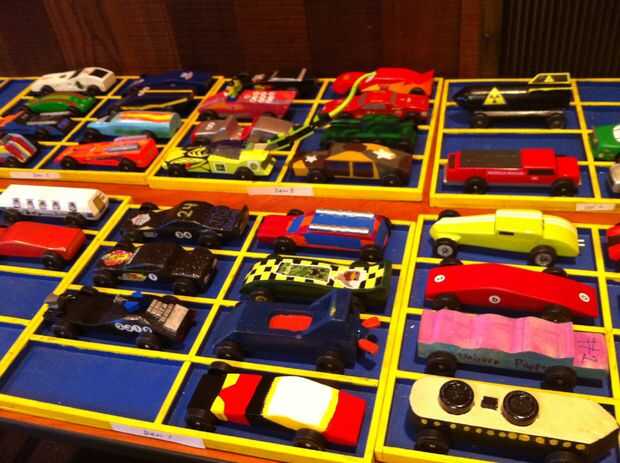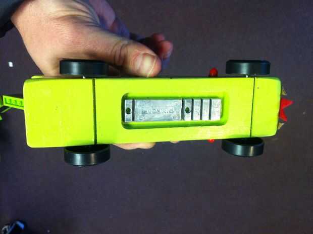 Nos fuimos hacia adelante y hacia atrás unas cuantas veces a la mesa con los pedacitos de metal y pistola de pegamento para hacer el peso. Por último, se aprobó nuestro coche para la carrera--estaban dentro 2/100ths de una onza y se colocó en "The Box" con los otros coches. Ni que decir tiene estaba parado hacia fuera un poco (ver foto).