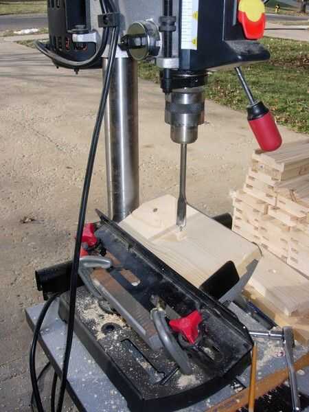 En la prensa del taladro, configurar la tabla a 25 grados. A continuación, ajusté la alineación de la plantilla para los golpes de la punta el centro de la madera. Por último, ajusté la profundidad del corte para asegurar que no perforar a través de la madera.