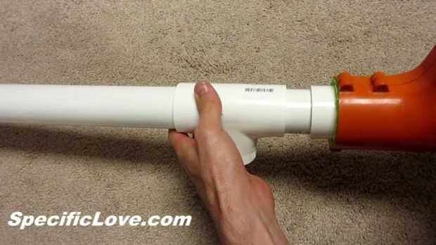 La sección restante de 2 pies de tubo se convertirá en el cañón, y os adjunto con el conector en T para la tubería de 3 pulgadas. El lanzador de bolas de ping pong trabajará en este punto, pero el sostenedor de la bola tiene que ser cargado desde debajo y torcido lentamente mientras la leña o las bolas rodarán por el cañón incontrolablemente.