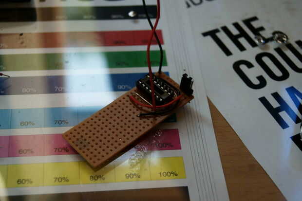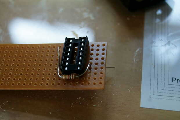 Agregar estos componentes y los cables. El resistor de 10K mantiene el chip de reposición, y el puente actúa como un interruptor,
