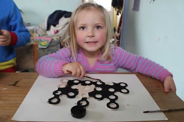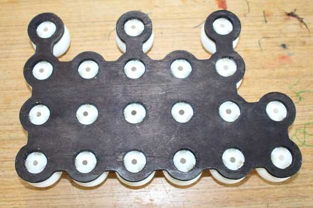 Elijo perforar todos los agujeros utilizando una sierra para que las bolas se sientan muy bien en la madera contrachapada. Luego tuve mi niña a "pintar" la madera de la capa usando tinta negra.