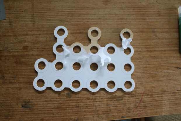 Luego las bolas estaban pegadas a la madera usando una pistola de pegamento.