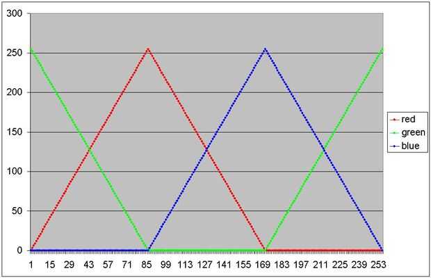 Por lo que encarga de la lectura y visualización de la hora, ahora vamos a echa un vistazo a los colores. Cada columna se establece en un color y la siguiente columna se cambia por un valor de determinar por el "incremento" cuanto mayor sea el número mejor el color variación sobre las 6 columnas. He encontrado que alrededor de 8-12 es un buen número. El color se decide por una rutina que toma se incrementa el valor de "g" (entonces llamada arco iris) un color, otro es disminuye y la 3ª se establece en cero, este entonces ciclos hacia arriba y hacia abajo a través de todos los colores y da un efecto agradable del arco iris (ver la gráfica para una mejor explicación). Un problema que he tenido que tuvo mucho tiempo para elaborar la soloution muy simple era cómo hacer el arco iris se mueven lentamente a través de las columnas. porque he caminado el color entre cada fila, si ahora quiero incrementar cada columna por sólo 1 entonces tengo que tener en cuenta que el número original de color era y restablece "g" a ese número luego agrega uno. Creo que tiene sentido.
