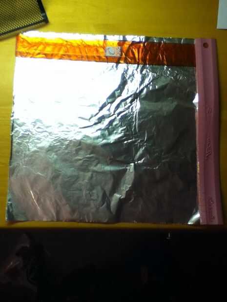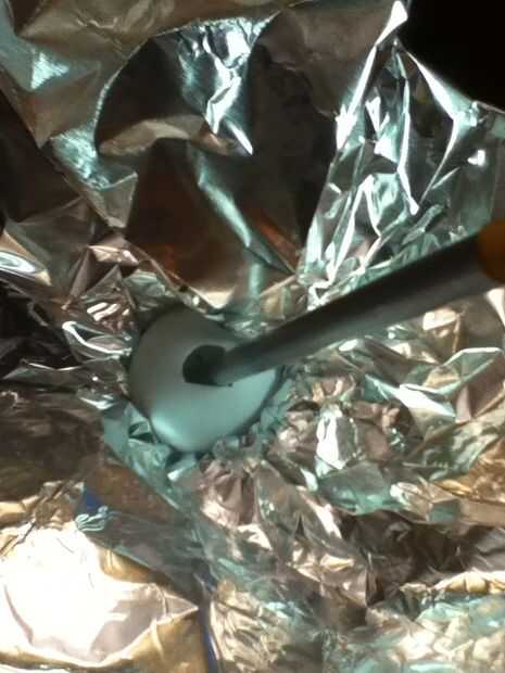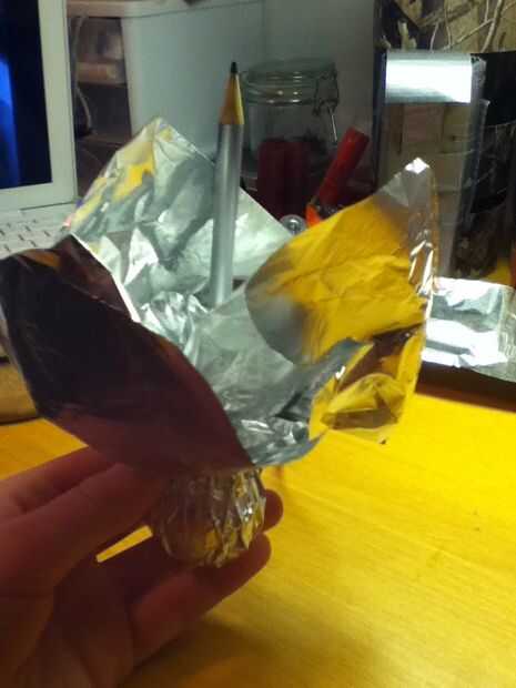 Luego tomar un trozo de papel de aluminio que es aproximadamente 12 pulgadas por 12 pulgadas y envolver la pelotita de ping pong y el lápiz.