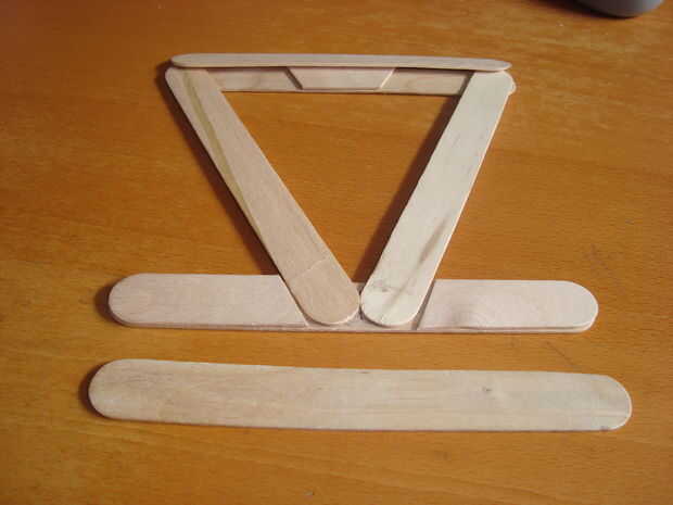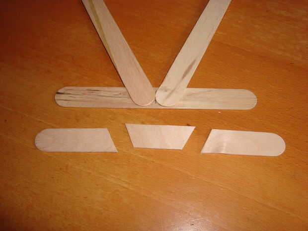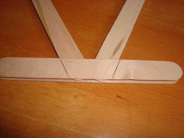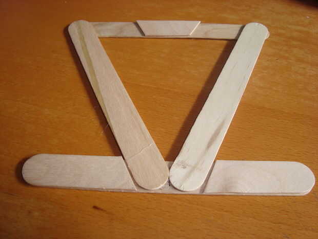 Cortar el palo de polo y el pegamento las dos piezas frontales hacia abajo y el pequeño pedazo medio pegamento en el centro en la parte posterior, finalmente pega otro palo sobre el frente y volver a crear una base muy fuerte