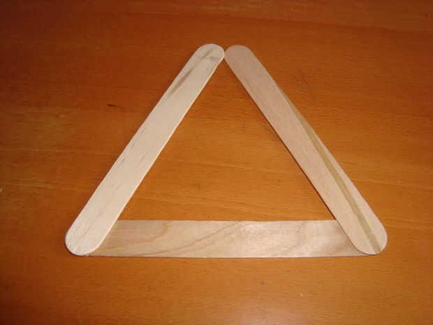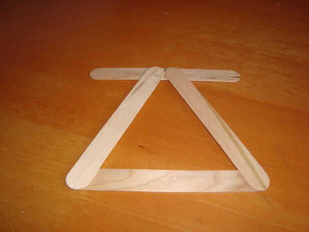 Ponga hacia fuera un palo de polo, pegamento dos extremos hacia abajo en el primer palo de Polo para crear un triángulo en la parte superior no se superponen estancia justo al lado de