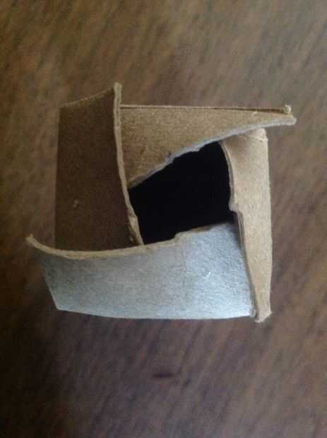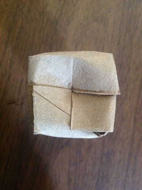Doblez papel higiénico de dos rodillos que son cilindros cuadrados. Corte aproximadamente dos centímetros por ambos lados (corte en las líneas de doblez!). Doblar las aletas hacia abajo hacia el centro y cada uno hacer un top de otro, sino también bajo diferentes. Dejar caer las rocas y hacer lo mismo a la parte superior. Para lograr que permanezca doblado, puede cinta hacia abajo.