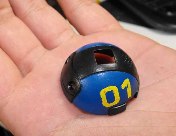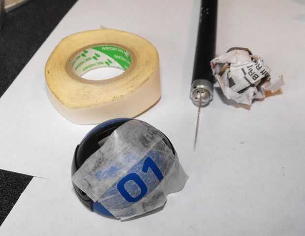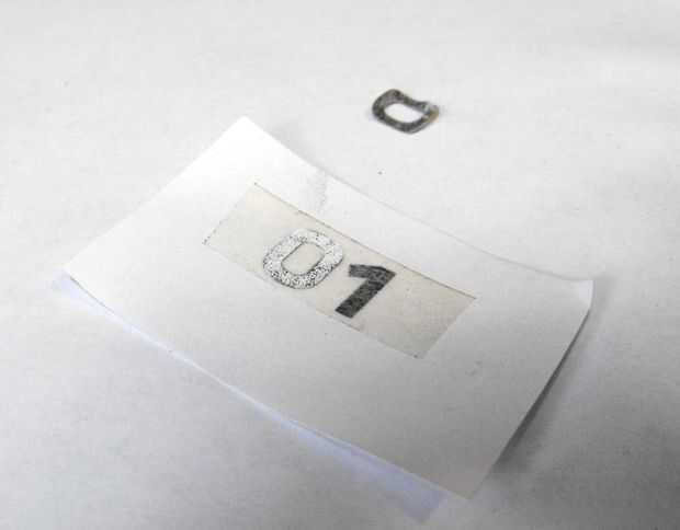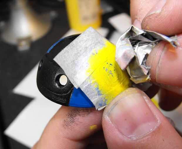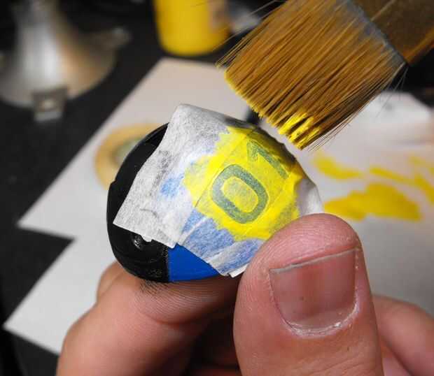 Después cubriendo un área considerable alrededor de los números, usé un cepillo duro para aprovechar la pintura amarilla en la plantilla. Cuando se utiliza pintura húmeda en las plantillas hechas de cinta adhesiva tiene una tendencia a remojo por debajo de la cinta y dejar un borde áspero. Esto se puede evitar sumergir la punta del pincel en la pintura, algo de él en una toalla de papel, y luego untar el pincel en la plantilla. Necesitaba aplicar varias capas para obtener el color amarillo que destaca contra el azul, pero valió la pena el esfuerzo extra.