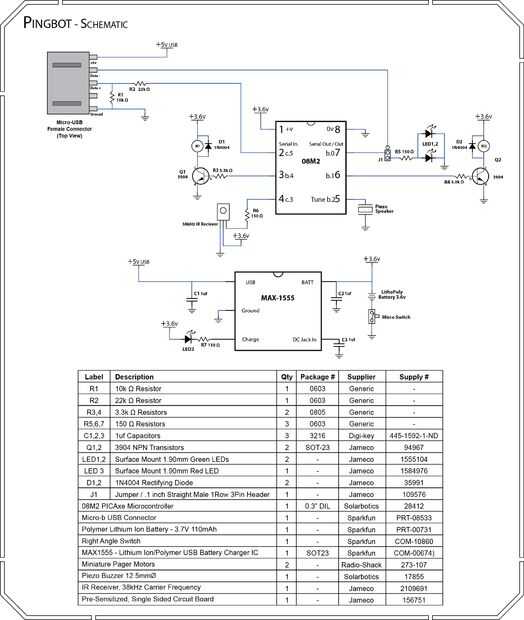 El robot es alimentado por batería de polímero de litio (LiPo). Un MAX-1555 IC se utiliza para cargar la batería mediante el mismo cable micro-USB para programación. Cuando el cable está enchufado en el robot, el 1555 se conecta al USB de Puerto + 5V pin y carga la batería de LiPo. Un micro interruptor conecta las baterías de tierra al circuito; la batería no se carga mientras está apagado. Mientras que carga el 1555 se enciende el LED rojo y luego lo apaga cuando la batería está llena.