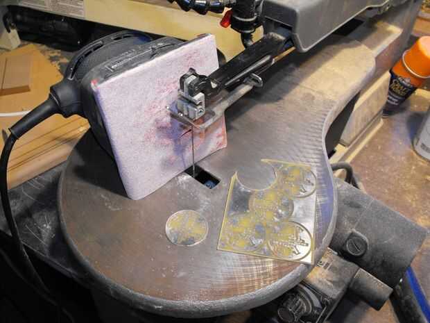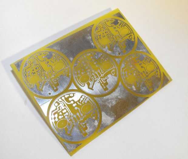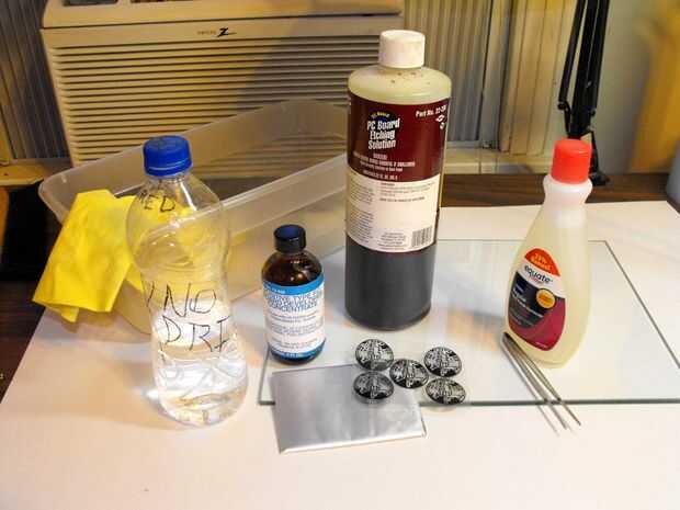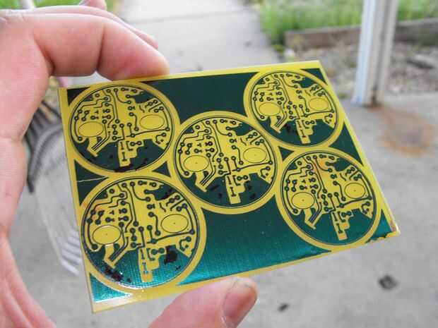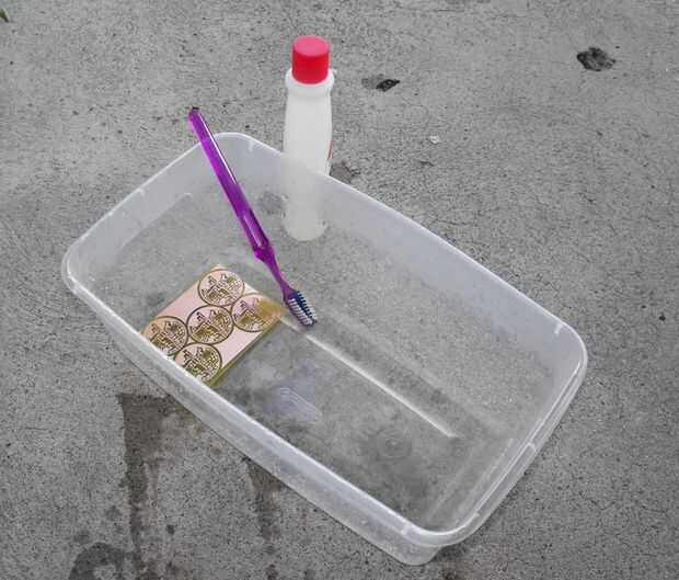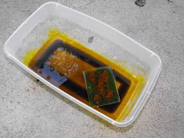 A continuación la junta fue colocada en un recipiente de tupperware pequeño junto con una mezcla de cloruro férrico y agua tibia. Otra vez sacudieron la tina para mantener el flujo de la mezcla. Después de unos minutos el cobre expuesto era comido lejos dejando sólo el diseño del circuito protegido y el tablero de fibra de vidrio.