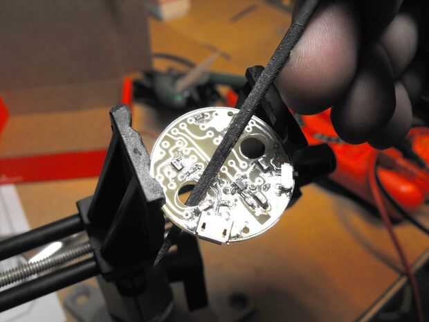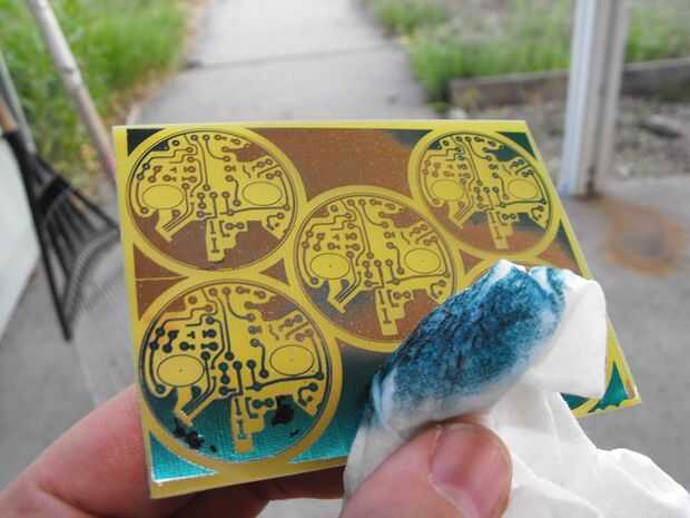 La capa fotosensible restante fue fregada apagado al tablero de circuito con quitaesmalte y un cepillo de dientes. Es importante limpiar bien la Junta. Si no está perfectamente limpia podrá ver las zonas sucias, después de que sea demasiado tarde.
