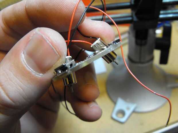 También debían taladre dos orificios más grandes para los dos motores. Estos agujeros de perforación fue bastante fácil con un taladro miniatura, pero también debían orientarse para permitir que los motores que actúan como ruedas. Para ello usé un pequeño archivo para formar la Junta de fibra de vidrio. Durante esta presentación me aseguré de poner los motores en los agujeros y el ángulo de la prueba hasta que lo conseguí. Es fundamental que estos agujeros se presentó en el mismo ángulo exacto para que los motores se sentaban correctamente.