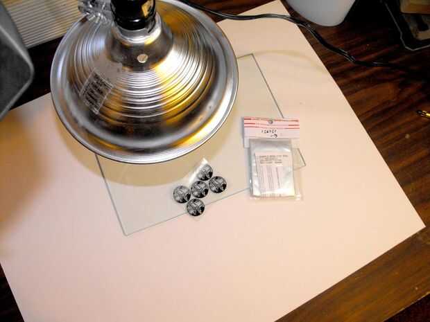 Mientras que en un cuarto oscuro he quitado el plástico protector de la placa de circuito previamente sensibilizada y había alineado el positivo en la parte superior. Para mantener todo en su lugar puse una pequeña placa de vidrio sobre el positivo. Las instrucciones que vienen con la palabra de Consejo para exponer la Junta 1 pie bajo una bombilla de 100 vatios durante 10 minutos, pero siempre he necesitado ir a por lo menos 12.
