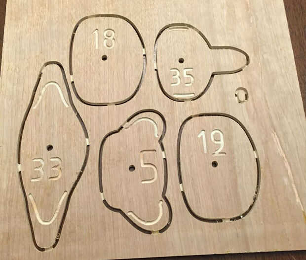 Como ya he mencionado en anteriores pasos, tengo un X-talle de Inventables. Tienen una herramienta base llamada base que te permite importar archivos SVG y configurarlos a recortar. Yo tenía 5 o 6 hojas preparó y cortar cada uno de ellos en mi máquina. Cada hoja de un contrachapado de abedul de 12 x 12 y tomó unos 45 min para cortar con un poco de molino plano.125.