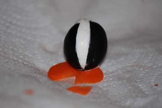 Fijar el cuerpo en una rebanada de zanahoria con una muesca cortada. A utilice la muesca para el pico del pingüino, para no reventar en la boca.