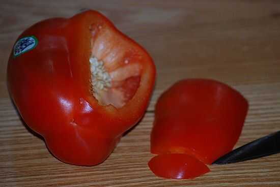 para hacer el santa hat, cortar un lado del pimiento rojo y hacer un borde recto para la parte inferior del sombrero.