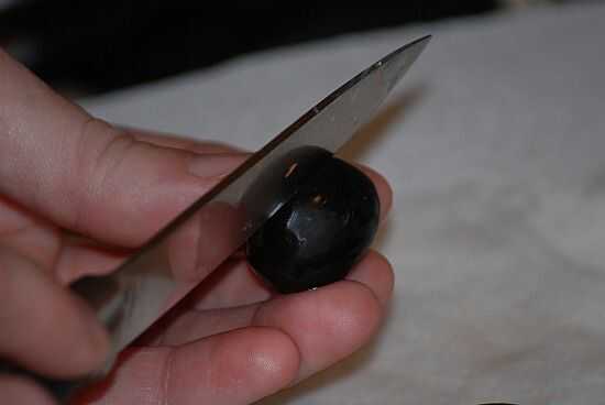 hacer un corte vertical en uno de lo Jumbo aceitunas, esto será el cuerpo, que rellenará con crema de queso. (Usarás 1/3 del bloque para pingüinos de cosas. Guarde el resto para el Iglú de "glaseado".)