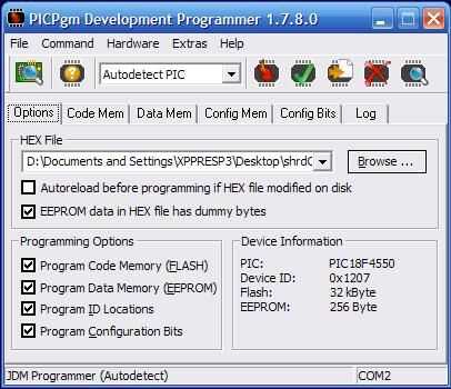 Usé el PicPGM programmer con mi programador serial JDM para cargar el archivo de cargador de arranque de destino (Bootloader_v4.13_18f4550_X20MHz.hex)