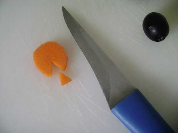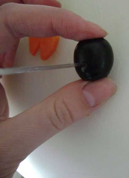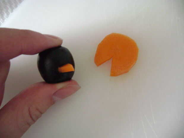 Cortar un pequeño triángulo de la zanahoria, se trata de pico de los pingüinos y el resto serán los pies.