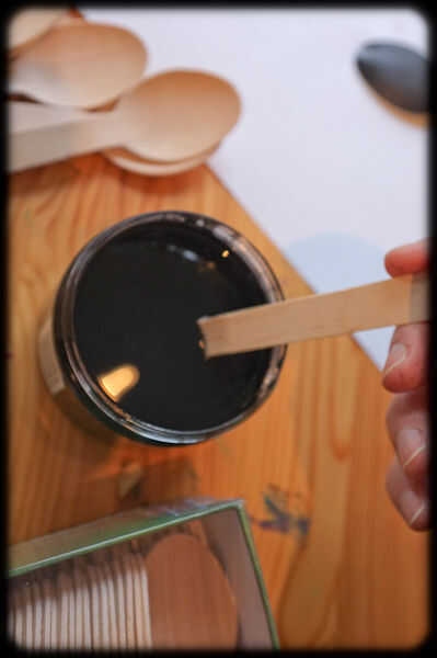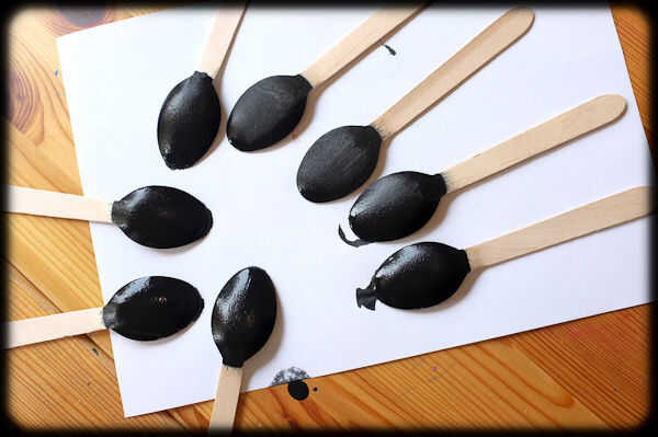 Si es necesario, verter la tinta en un vaso con una apertura amplia. Sumergir una cuchara en la tinta hasta que la taza está completamente cubierta. Permita que el exceso de tinta escurrir y poner en un trozo de papel para secar. Preparar tantas cucharas como sea necesario.
