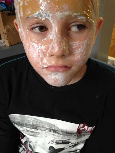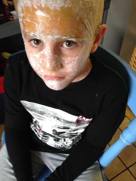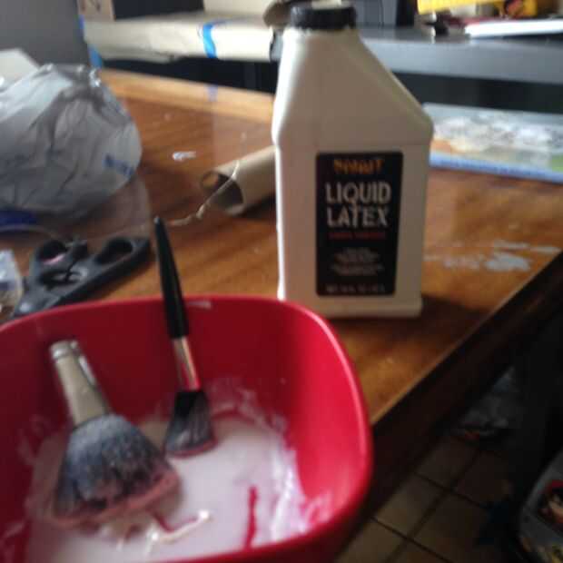 Primero ponemos en una gorra calva con la goma del espíritu, entonces latex líquido va de blanco, pero se seca claro. Aprendí a hacen de un tutorial de youtube buena. Utilizamos el pegamento para las uñas que tenía las puntas cortadas.