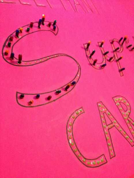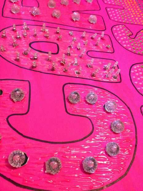 Delinear cada palabra con un rotulador negro. Utilice resplandor en las pinturas de soplo oscuro para rellenar en "lavado" y el otro texto del esquema