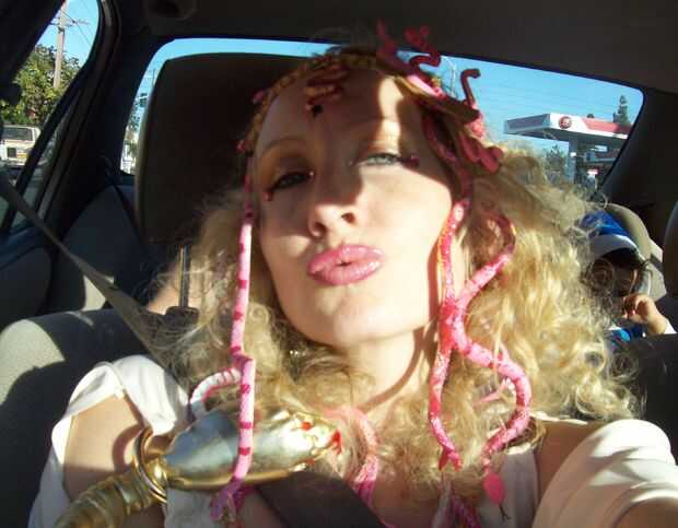 Usé 60 rulos la noche anterior para obtener rizos locos. Me puse cuñas de oro que tienen una serpiente envolviendo alrededor del frente.